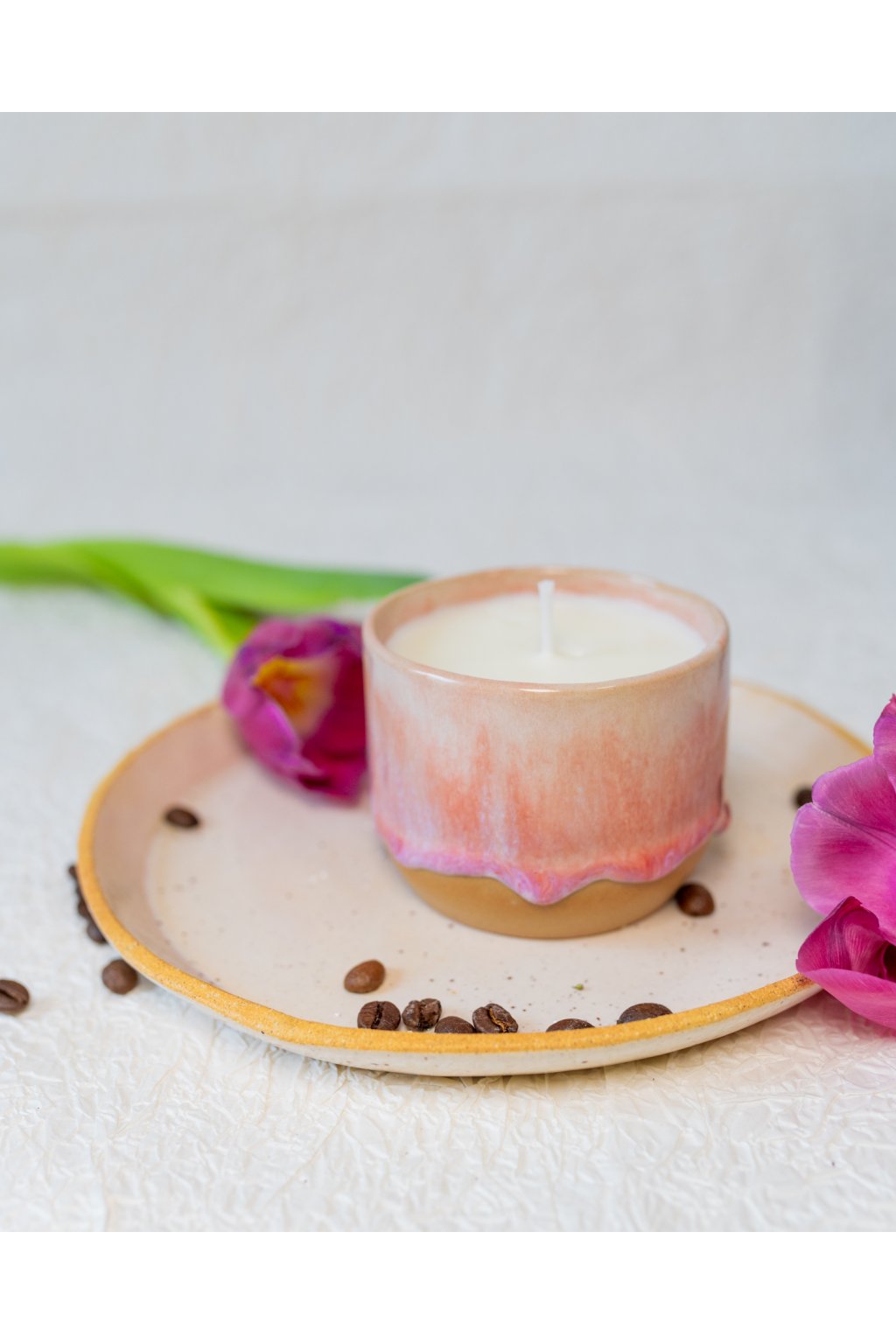 Ručně odlévaná sójová svíčka v keramickém kalíšku - růžová 1 (150-170 ml)