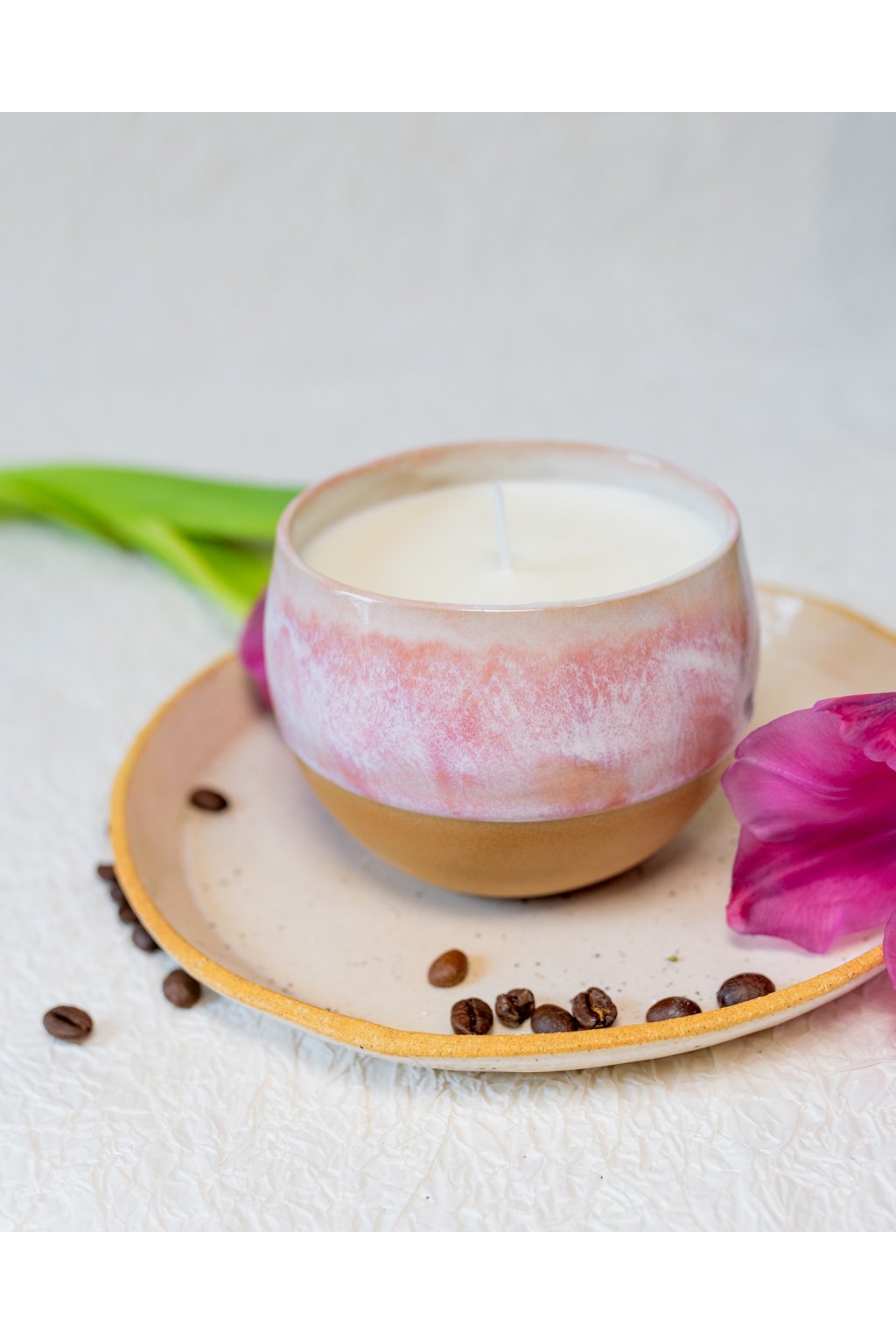 Ručně odlévaná sójová svíčka v keramickém kalíšku - velká RŮŽOVÁ (300 ml)